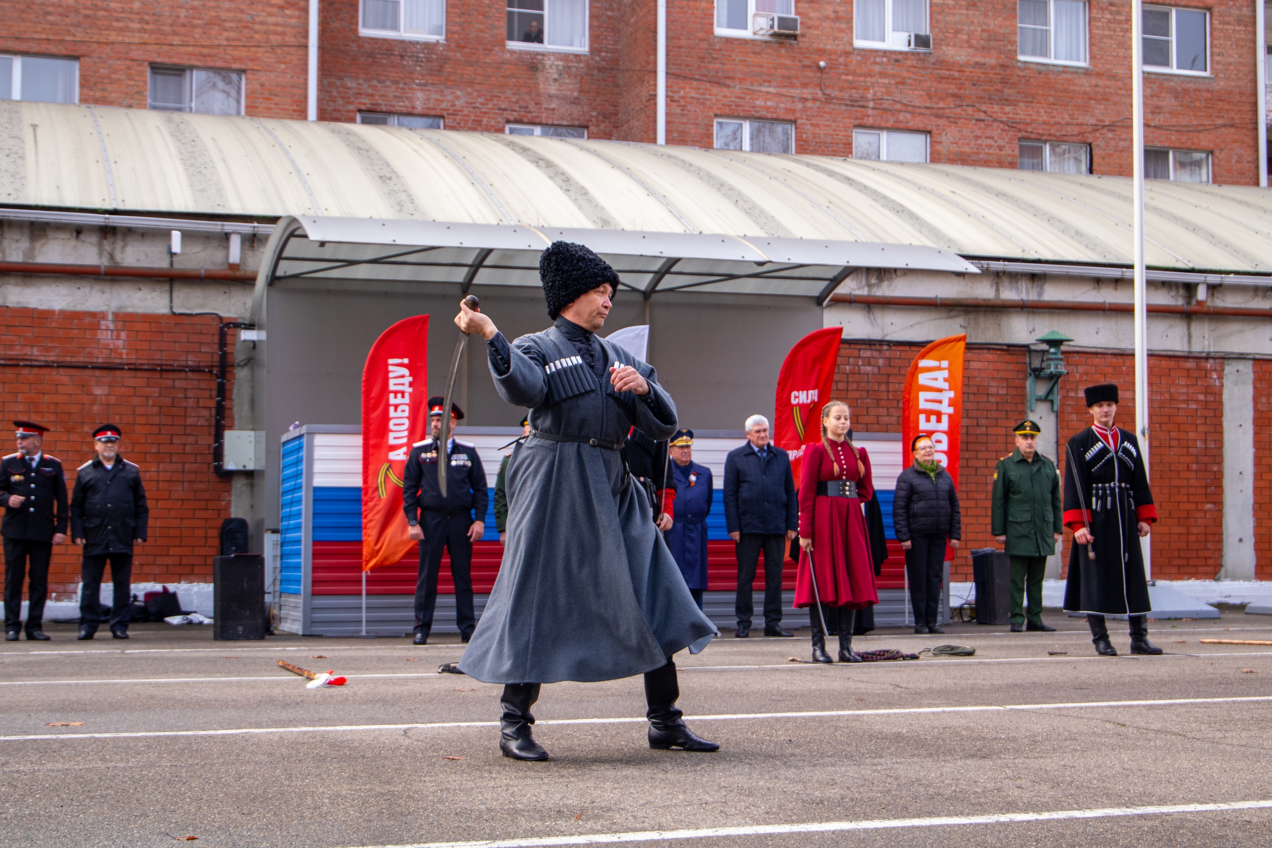 Зарядили новобранцев боевым духом показательные выступления отрядов «Честь имею!», «Стальной дух» и «Дух воина» с элементами рукопашного боя, фланкировки и искусного обращения с оружием.