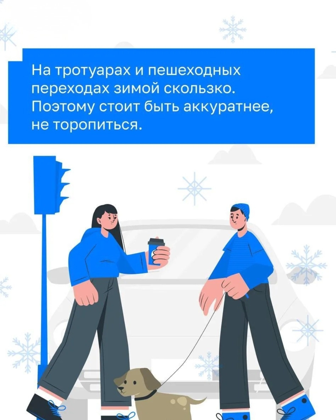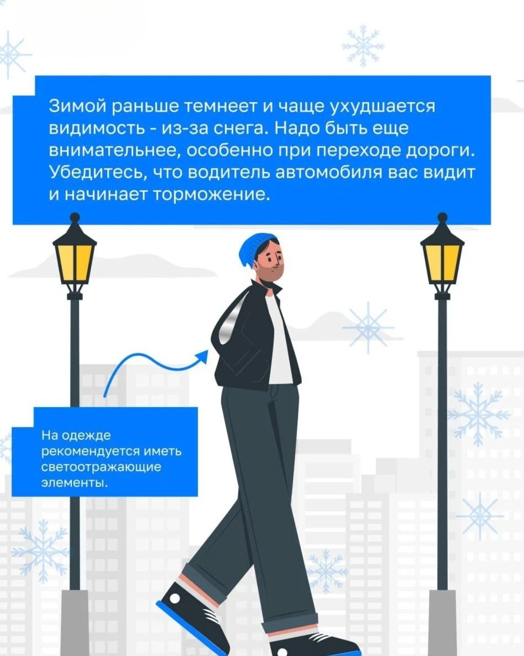Пешеходы: в холод и снег видимость хуже — убедитесь, что вас заметили. Безопасность важнее скорости! Водители, будьте внимательны и держите дистанцию. Помните: резкий маневр — риск.