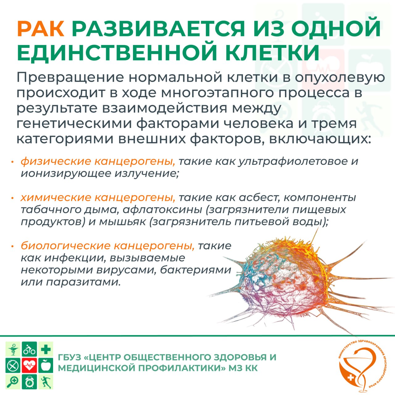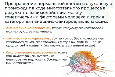 Онкологические заболевания (рак) представляют собой более 100 разных болезней, поражающих любые системы и органы человека. Наиболее частыми причинами смертности от рака являются заболевания лёгких, желудка, печени, толстого кишечника и молочной железы.