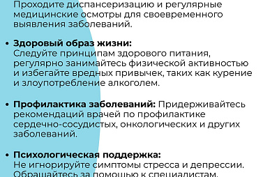 Соблюдение простых правил здорового образа жизни для мужчин позволит сохранить здоровье и качество жизни на долгие годы. А также регулярная диспансеризация с оценкой рисков заболеваний позволяет своевременно выявить предрасположенность или серьёзные заболевания на ранних стадиях, когда большинство патологий поддаются эффективному лечению или контролю. С 18 до 39 лет рекомендуется проходить диспансеризацию 1 раз в 3 года. С 40 лет и старше — ежегодно.