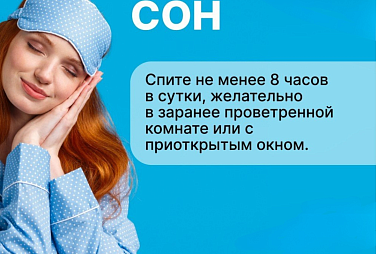 -режим труда и отдыха. Необходимо спать не менее 8 часов в сутки в хорошо проветренном помещении.