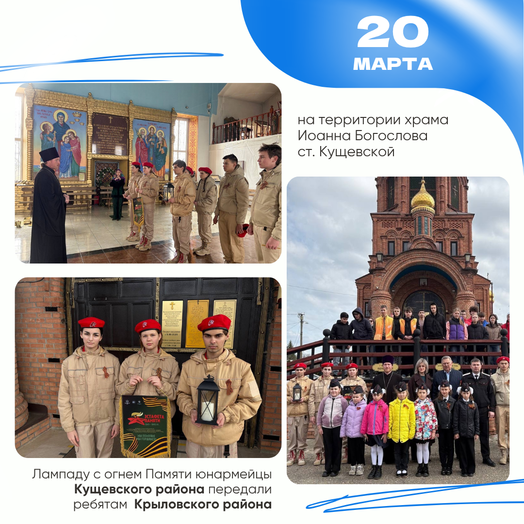 20 марта - на территории храма Иоанна Богослова ребята из Кущёвского района передали лампаду с огнем Памяти юнармейцам Крыловского района.