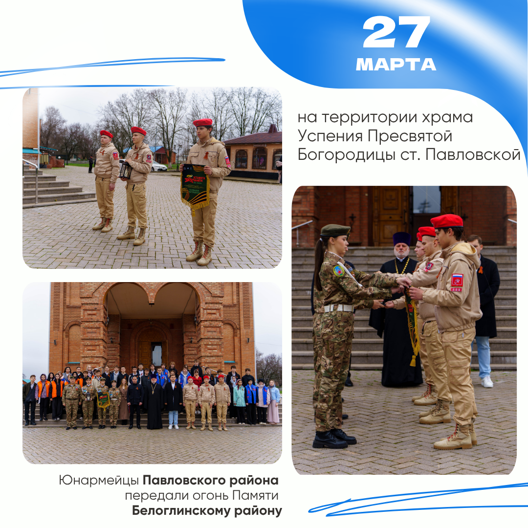 27 марта - на территории храма Успения Пресвятой Богородицы из рук юнармейцев Павловского района лампаду с огнем Памяти получили ребята Белоглинского района.