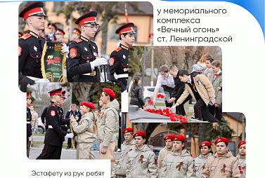 18 марта - у мемориального комплекса «Вечный огонь» эстафету из рук представителей церемониального отряда «Честь имею» Ленинградского района приняли юнармейцы Кущевского района.