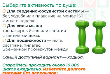 Снижения риска развития хронических заболеваний: Правильное питание и физическая активность играют ключевую роль в профилактике таких серьезных заболеваний, как сердечно-сосудистые патологии (гипертония, инфаркт, инсульт), сахарный диабет 2 типа, ожирение, некоторые виды рака.