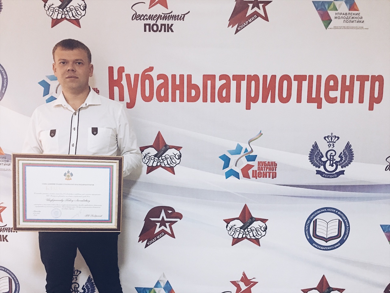 Поздравляем заместителя начальника отдела военно-патриотического и гражданско-патриотического воспитания ГКУ КК "Кубаньпатриотцентр" Павла Шафоростова с объявленной благодарностью от ГУБЕРНАТОРА КРАСНОДАРСКОГО КРАЯ за активное участие и большой личный вклад в подготовку и проведение особо значимого мероприятия - XIX Всемирного фестиваля молодежи и студентов в городе Сочи!