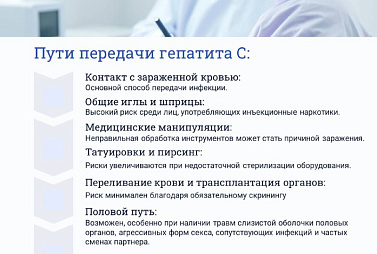 Вирус гепатита С содержится в крови и других биологических жидкостях зараженного человека. Основные пути передачи: