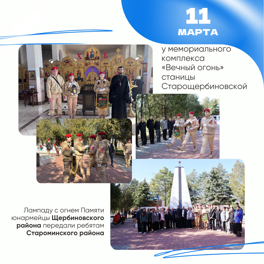 11 марта - у мемориального комплекса «Вечный огонь» ребята из Щербиновского района передали лампаду с огнем Памяти юнармейскому отряду Староминского района.
