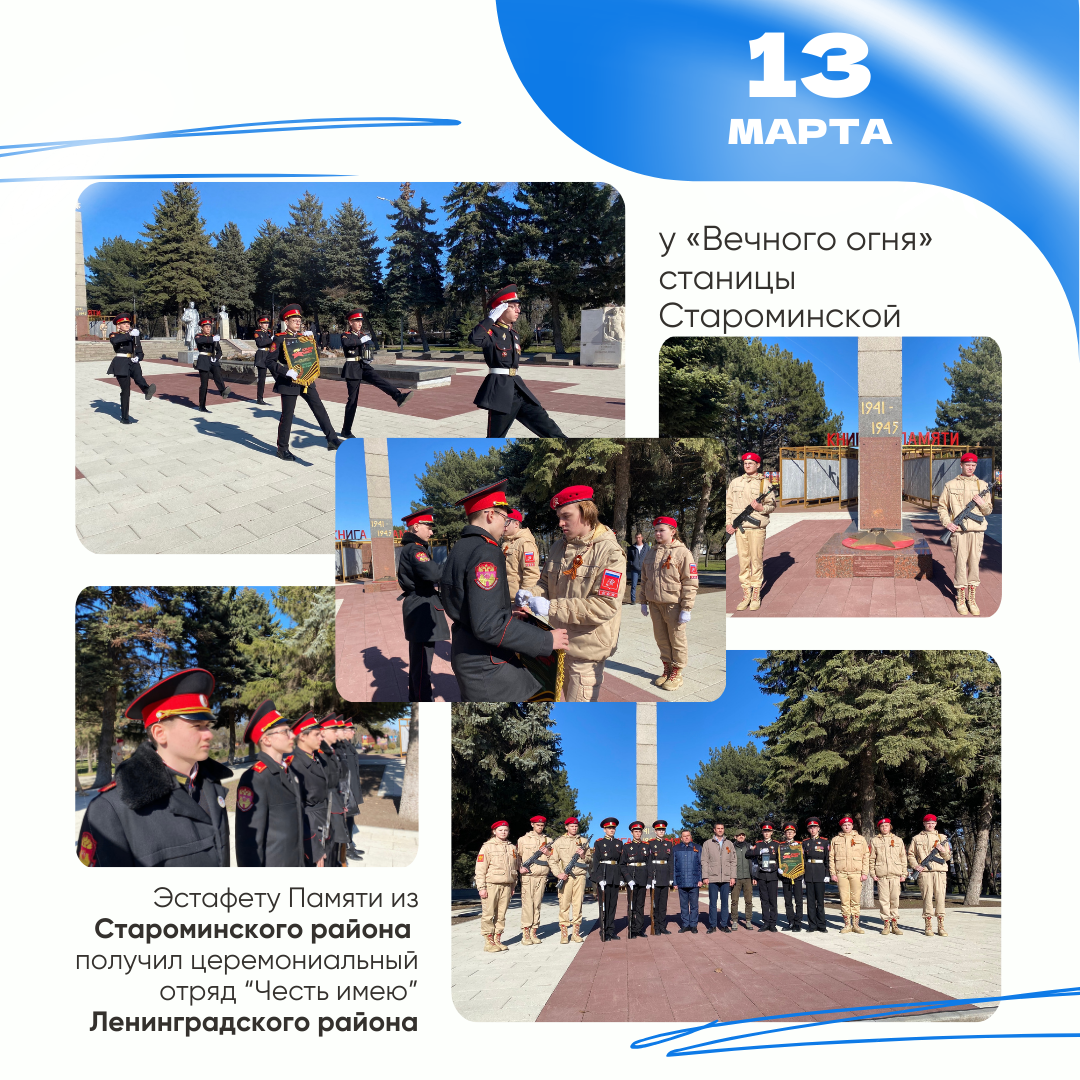 13 марта - у «Вечного огня» от юнармейцев Староминского района эстафета перешла церемониальному отряду «Честь имею» Ленинградского района.