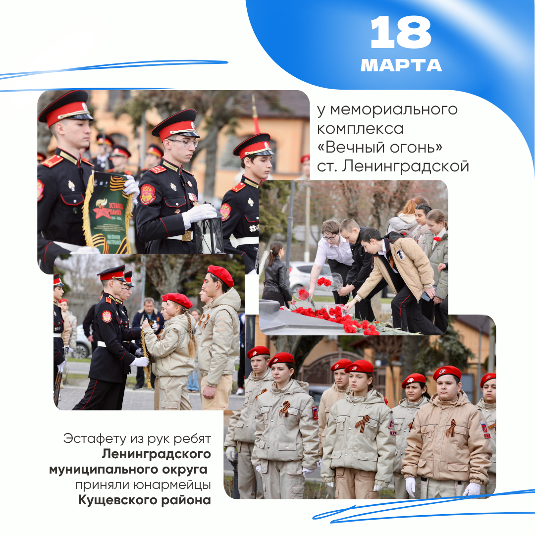 18 марта - у мемориального комплекса «Вечный огонь» эстафету из рук представителей церемониального отряда «Честь имею» Ленинградского района приняли юнармейцы Кущевского района.