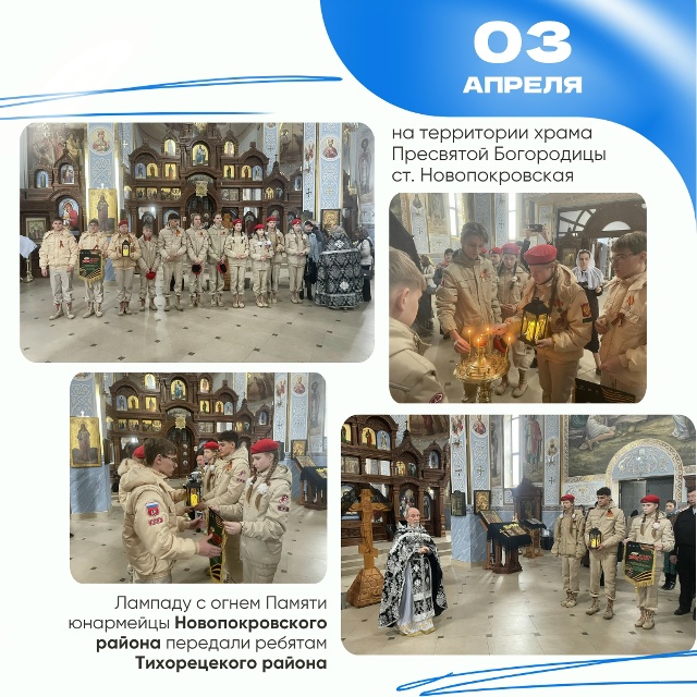 3 апреля - на территории храма Пресвятой Богородицы ребята из Новопокровского района передали лампаду с огнем Памяти юнармейцам Тихорецкого района.